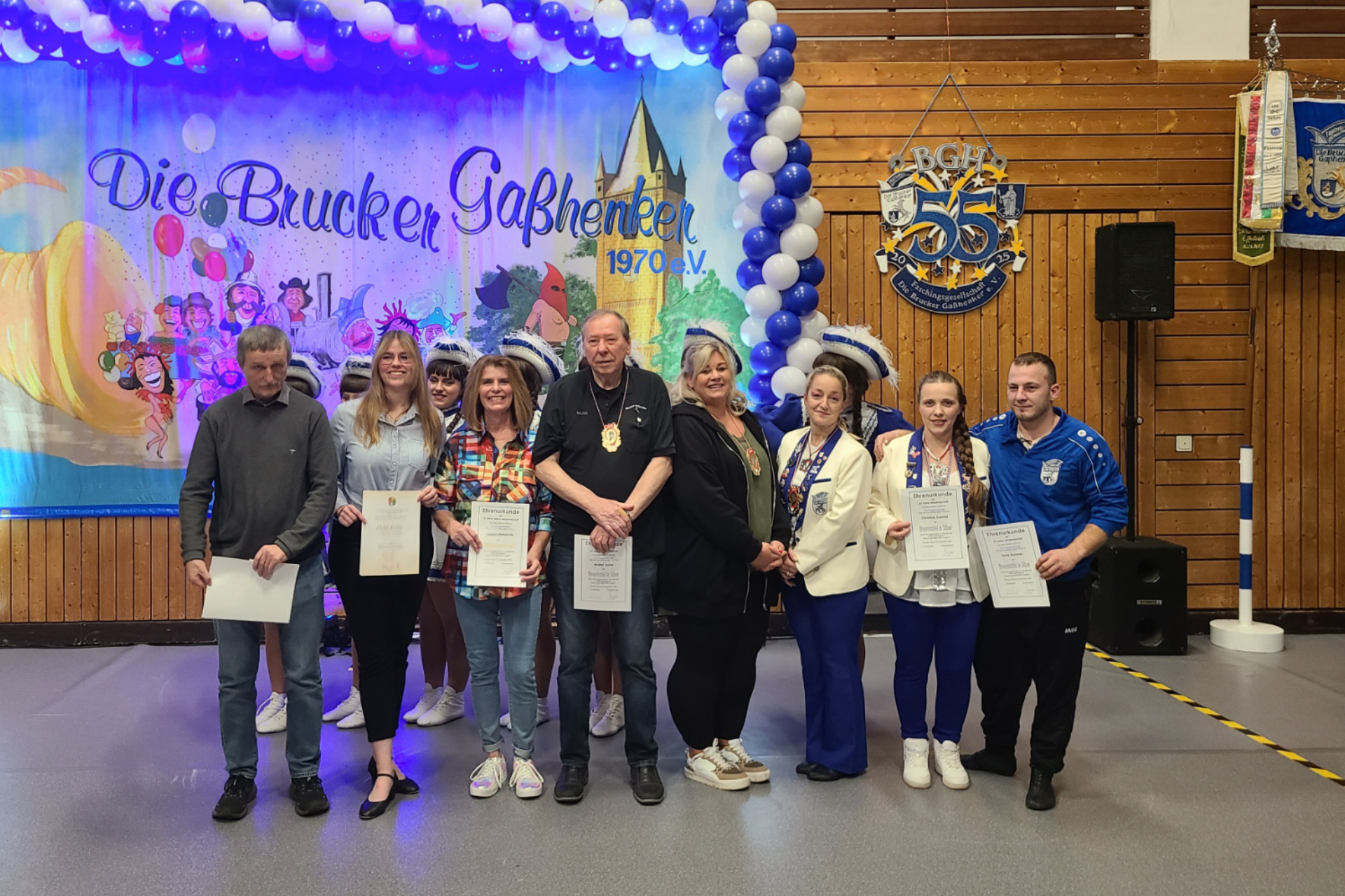 Im Rahmen der Narrendämmerung am 08.11.2025 wurden wieder einige verdiente Mitglieder mit Ehrungen ausgezeichnet. 25 Jahre im Verein und damit mit der Ehrennadel in Silber ausgezeichnet wurden Renè Brunner, Walter Forke, Thomas Groß und Christine Kremer.